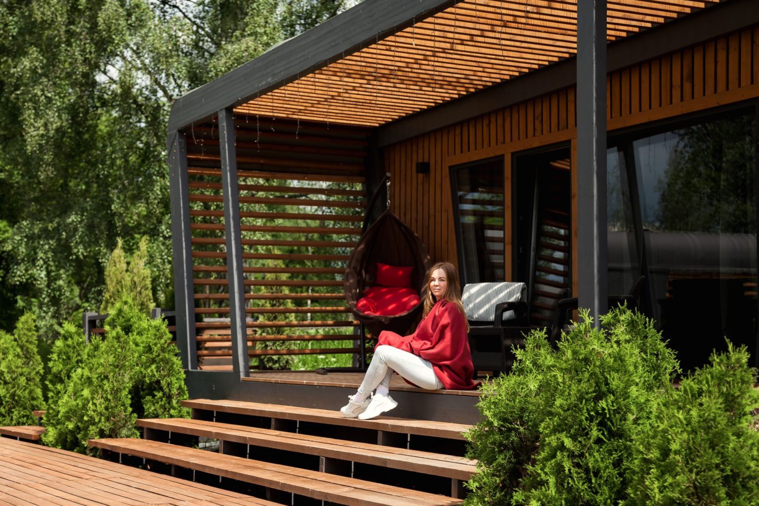 4. Gemütliche Gartenlounge: Ein offen gestaltetes Gartenhaus mit großer Terrasse und Loungemöbeln lädt zu lauen Sommerabenden, Grillfesten oder einfach zum Entspannen ein.
